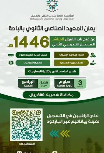 أعلن المعهد الصناعي الثانوي بالباحة عن بدء استقبال طلبات القبول والتسجيل للفصل التدريبي الثاني من العام 1447هـ، وذلك لبرامج الدبلوم الصناعي الثانوي لمدة ثلاث سنوات بالإضافة إلى البرامج التدريبية الفصلية المتخصصة ويهدف المعهد إلى تطوير مهارات الطلاب وتأهيلهم لسوق العمل في مجالات تقنية وصناعية متنوعة.